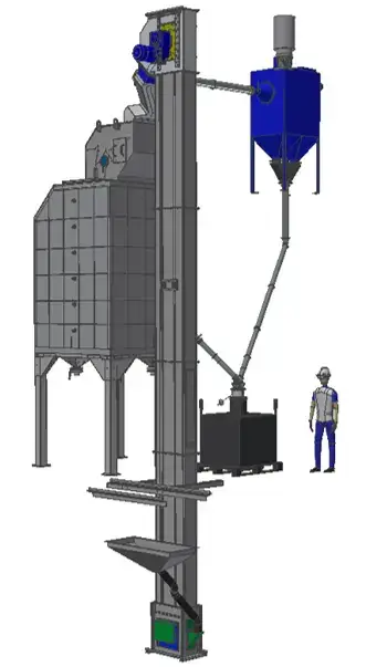 The belt transport carries the abrasive under the technical room of the large blasting hall and deposits it into the elevator foot via a funnel. In order not to overfeed the belt transport, funnels are placed above the belt, which are provided with a dosing device. Coarse contaminants are separated from the abrasive by grids on top of the hoppers. If desired, the grids can be fitted with plates with small holes (perforated plate) in order to separate even smaller contaminants.