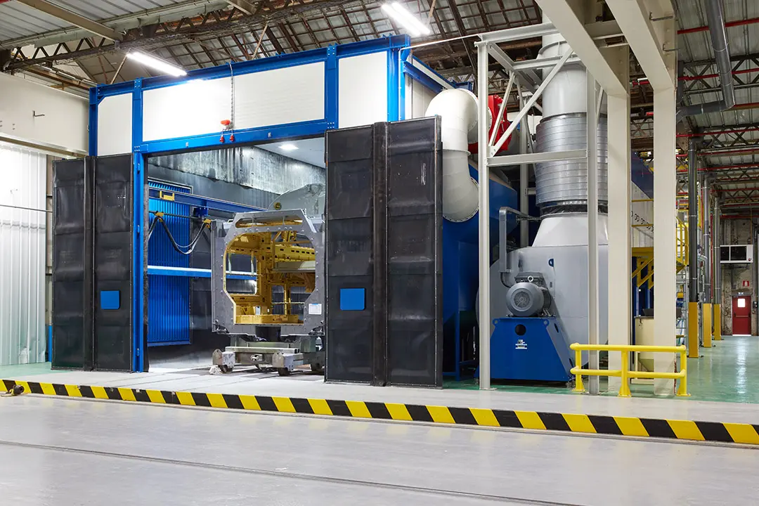 This cabin allows full grit blasting of rail wagons measuring 27 m x 3 m x 4.7 m with 2 types of abrasives (metal grit and corundum).