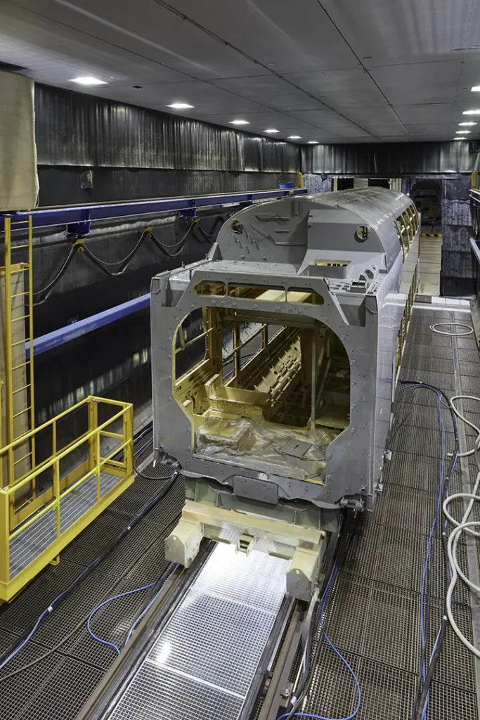 The very well insulated cabin dimensions 30 m x 7.1 m x 6 m(LxWxH). In sandwich panels, it is armoured with rubber. It is reinforced by a very compact rigid frame structure, which supports the movement of 2 motorized longitudinal work platforms and will, in the future, allow to work with a transversal gantry equipped with a grit blasting robot.