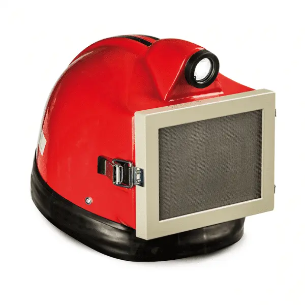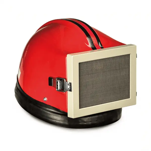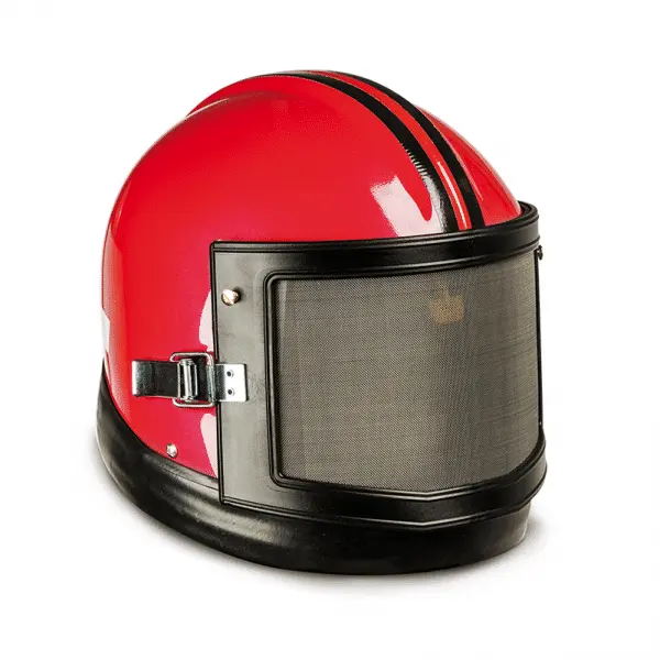 Hood with compressed air supply especially designed for abrasive blasting operations. The rigid helmet is standard delivered with a coated cape, protecting the head, neck, shoulders and chest against ricocheting abrasive. A neckband made of an elastic material protects the inside of the helmet from dust by maintaining it under a slightly positive pressure.