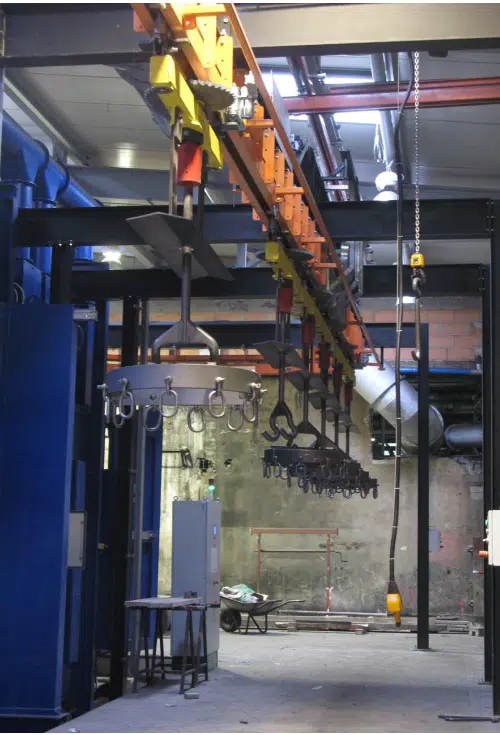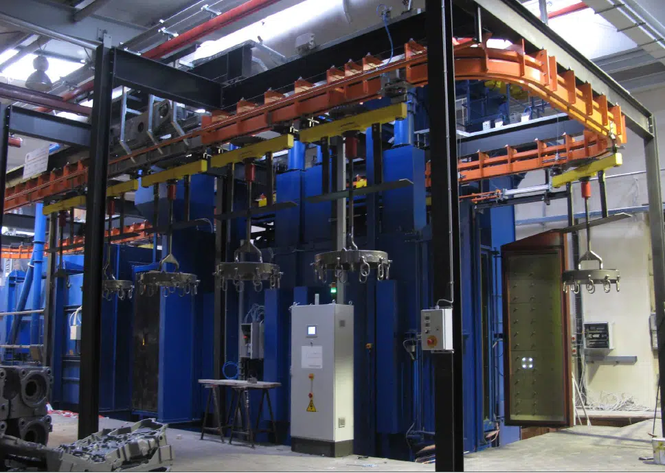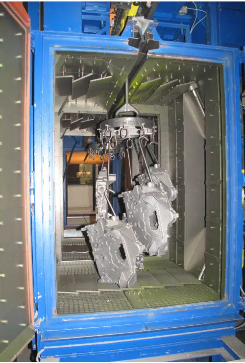 Straaltechniek has been developing standard and customized machines to various clients to meet particular needs in foundries. One of the most wides machine in foundry applications are a hang rail wheel blasting system which are offered as inline solution that offers semi-automatic blasting or fully automatic blasting capabilities.