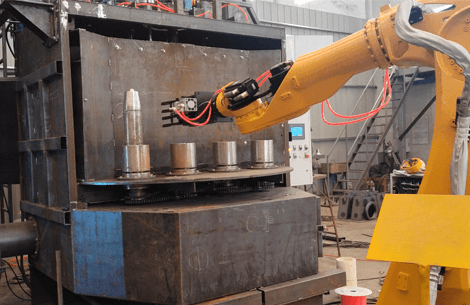 The interior wall shotblasting equipment is furnished with two turntables that operate in an alternating manner. The robotic arm can grasp two workpieces at a time and place four workpieces onto the turntables in two separate operations. Once placed, the products will be clamped firmly. Driven by the rotation mechanism, the turntables will start to rotate automatically. Meanwhile, the pressing mechanism will automatically apply pressure to the workpieces, and the inner wall spray guns will ascend and descend automatically to conduct the cleaning process on the workpieces. When the products on one turntable are undergoing processing inside the machine, the other turntable can be used for loading or unloading operations outside the machine. In this way, four cartridge cases can be cleaned simultaneously, and the cleaning time can be set as desired. After the cleaning is completed, the turntable inside the machine will rotate out, while the external turntable will rotate into the enclosed cleaning station, thereby ensuring the seamless and continuous progression of the processing flow. Moreover, the rotation speed of the turntables and the sandblasting speed are synchronized to perfection.