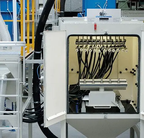 This installation is fitted with 12 programmable nozzles, thereby realising a fully automatic shot peening process. Moreover, the complete recovery and classification of blasting media was provided for.