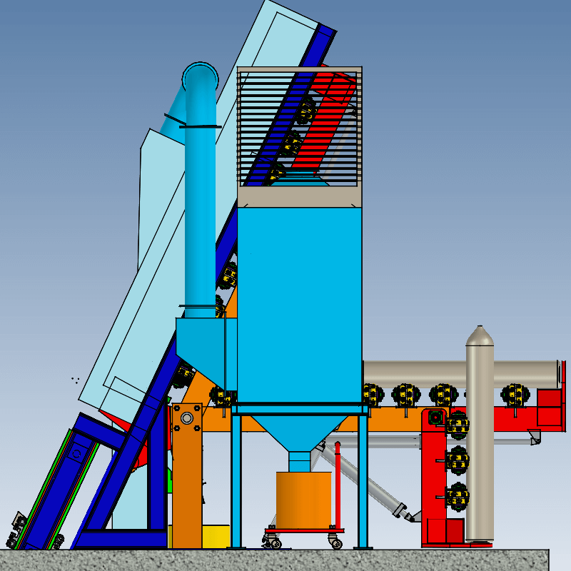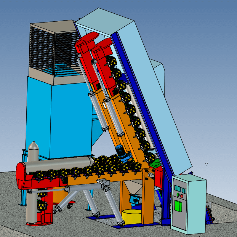Once the cylinder positioned in the blast chamber, specially engineered spray guns automatically extend into the cylinder and perform a complete vertical stroke—from the opening flange through the side wall to the bottom and top covers—ensuring thorough and uniform coverage of the entire inner surface. Upon completion of blasting, the abrasive flow is automatically shut off, and the same system blows residual media out of the cylinder. This integrated design allows full pre-treatment within a single workstation. The blast assembly then retracts, and the cleaned cylinder rolls automatically to the unloading platform, completing the cycle. The machine is equipped with a closed-loop abrasive recovery and recycling system that continuously cleans and classifies the media. Only high-quality abrasives are returned to the blasting circuit, while degraded particles are directed to a central filtration unit for removal. Operated by a single technician, the system delivers maximum throughput and features an intelligent control panel for easy operation, monitoring, and maintenance.