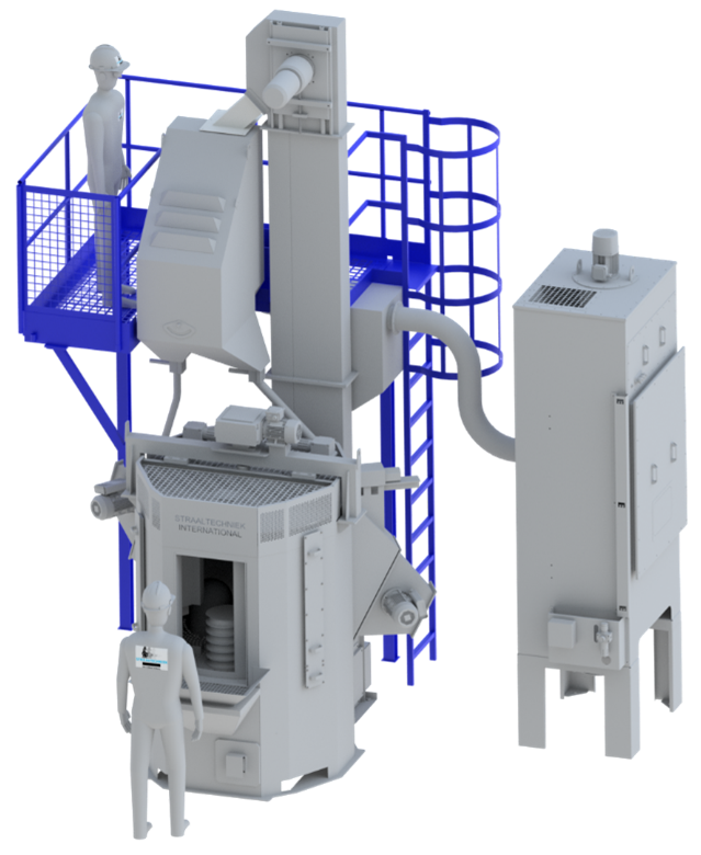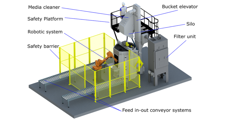 The doors come with safe interlock mechanism which ensures that the machine shuts down if the door(s) are opened during the shot blasting process. The shot blast chamber houses the turntable on which the products to be blasted are placed. The abrasive ejected out from the blasting wheel impact the part and drop down. The abrasives fall through the perforated table and is fed to the bucket elevator via a chute/hopper system. For larger size of the machine, the hopper comes with a screw conveyor system that transports the abrasive media from the hopper below the table to the elevator. The abrasive shot blast chamber and the table is designed so that the abrasive media is retained and falls through to the hopper/chute and does not fall out of the machine when the doors are opened. The abrasive media is reused multiple times in the machine and this is achieved by the shot blast media recovery system which consists of elevator, media cleaner and storage Silo. The shot blasting media/abrasive is fed back to the abrasive blasting wheel/turbines via valves and hoses.